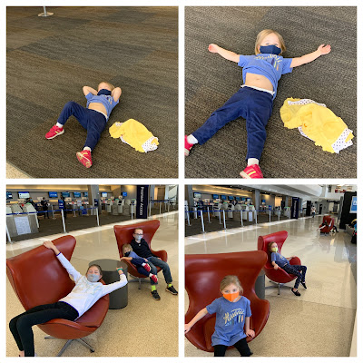 Wednesday, Adam was so nice to be here by 4:45am to drive us to the airport. Getting through security went fine. Boarding the plane went fine. Then we sat on the plane and waited... and waited... Eventually the pilot came on the speaker and told us they got a "caution light" that wouldn't allow them to take off until it was fixed. We got off the plane and waited at the terminal until they told us our flight got bumped so late, we would miss our connecting flight out of Phoenix. They were very helpful in rebooking our flights for free. PS- this was our first time in the new Salt Lake City airport and it's really nice! Our original flight was on American Airlines. Our new flights would be on Delta (to San Francisco), and then on United (to Honolulu). We had a 5-6 hour layover in San Francisco and sadly, because of a mandatory 10-day quarantine for anyone landing and staying in that county, we were not even able to leave the airport to explore. We also had a little bit of a hard time tracking down our one suitcase that came with us from Salt Lake. It was eventually located and we hung out at our United gate for a long time. The kids watched movies, we napped, and we ate free food thanks to some food vouchers American Airlines gave us. The kids loved playing on the moving sidewalks. We also waited in line to show our negative Covid tests and get a wristband so we wouldn't have to wait in more lines once we landed in Honolulu and show the Covid test there in order to leave the airport. More of us slept on the flight to Hawaii and I decided even though it was a very long day of wearing a mask, I was thankful it covered my mouth hanging wide open while I slept. :) We finally landed in Hawaii around 10pm their time, which was 1am in our brains. Dan's parents rented a 15 passenger van which was so nice to have! We arrived at Grandma and Grandpa's house around 11:30pm and got everyone to sleep quickly. It was Such. A. Long. Day of travel, and I was very grateful I experienced very little motion sickness!