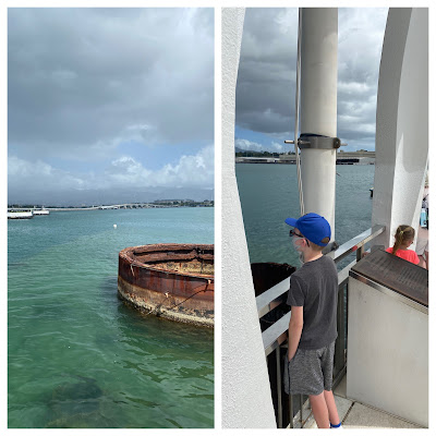 Sunday morning we had our usual oatmeal and Dan and McKenna joined their Zoom meetings for church. Grandma and Grandpa did their study time. I showered and kept laundry moving. The kids tried on their matching Hawaiian outfits! We held an at home sacrament meeting and loved singing hymns with Grandma and Grandpa. We left the house by 10:30 and headed to Pearl Harbor. Before we went in, we met up with Liv Mortensen who is a missionary serving on O'ahu from our Bountiful Stake. She needed us to take home her old ukulele since she bought a new one recently. It was so fun to see her! We walked around the museums and saw the history behind the bombings. We had a wait a bit to get on the boat out to the memorial, but the stand by line came through for us! We ate a picnic lunch in the parking lot while we waited. The kids were well behaved at the memorial and seemed to understand the significance of it.