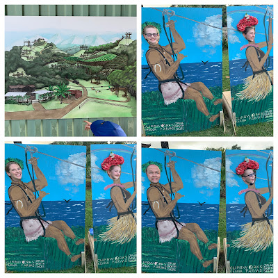 Friday morning Grandma spoiled us with Hawaiian waffles (coconut syrup, chopped bananas, coconut flakes, chopped macadamia nut, and whipped cream toppings!). We saw my sunblock fails on Anna and Ben from the day before. We had a leisurely morning and then had a brief shopping trip to Halaewa. Alice was very concerned her "friend" (the mannequin) didn't have a face. :) We had lunch at a nice restaurant called The Beach House. The fries were amazing giant potato spirals. Then we went back to the house and took the 4 youngest to the park behind Grandma and Grandpa's house. It was so beautiful to play at a park with the Laie Temple in the background! Grandma and Grandpa were then nice enough to babysit Bethany and Alice while we and our older three went zip lining! McKenna, Ben, and Anna all said this was their favorite part of Hawaii! Anna looked terrified on the first line, but then it quickly turned into a huge smile! Again, we were spoiled with perfect weather! Our guides were Jordan, Lad, and Jen.