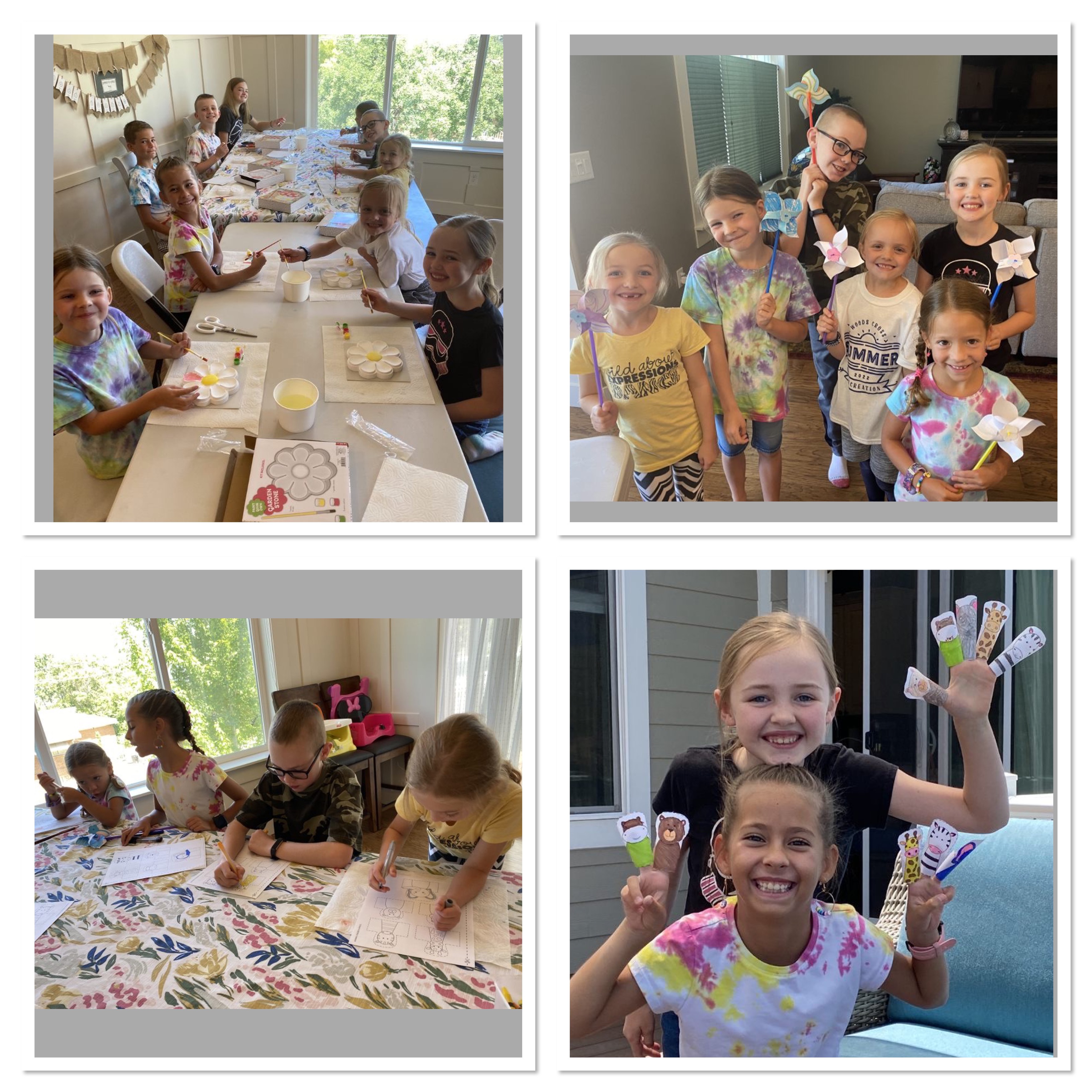 June 29th- Wednesday: McKenna and I went for a run. After breakfast, Ben left with Caleb to go see a movie. I got ready for the day and then went to my voice lesson. The girls played nice. We had a lot of friends come over after lunch. Caleb and Luke for Ben, Jaylee and Millie for Anna, and Payton for Alice. McKenna also babysat Evy West while Mariana was at a doctor’s appointment. I worked on some blog stuff. McKenna, Ben, and Bethany went to Grandma camp where they made a rainbow craft and tried to crochet. Anna had gymnastics. I worked on the blog and napped. After dinner, Ben and Dan went on a hike with the Teacher’s Quorum. I took the three little girls to Smith’s so Bethany could pick out birthday gifts for two friends then we did baths and cleaned up toys. McKenna practiced her flute with Bridget for girls camp. I blogged more once kids were in bed.