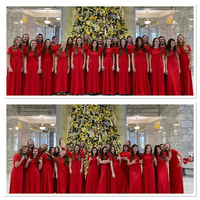 Dec. 7th- Wednesday: Dan and I showered before the kids got up because he was leaving early to donate and I drove the kids to school. Then, Dan, Alice, and I went to the State Capitol to hear McKenna’s Madrigals choir perform! They sounded so good in there! Alice and I came home and I tried to nap but ended up spending time on my phone. We had lunch and Alice went to preschool in a new leotard. I worked on recording the melody of the song our family would sing in Sacrament meeting. The kids got home and they went to piano. I blogged and made phone calls. I picked kids up and then helped with homework. Ben had a cold and we kept him home from Newsies. We ate dinner together and Anna had a primary activity at Mudrow’s. Bethany had hip hop and McKenna and I had our YW’s Christmas party. We painted ornaments and played a relay race game. It snowed a little. When we got home, we helped Ben film more for his book project.